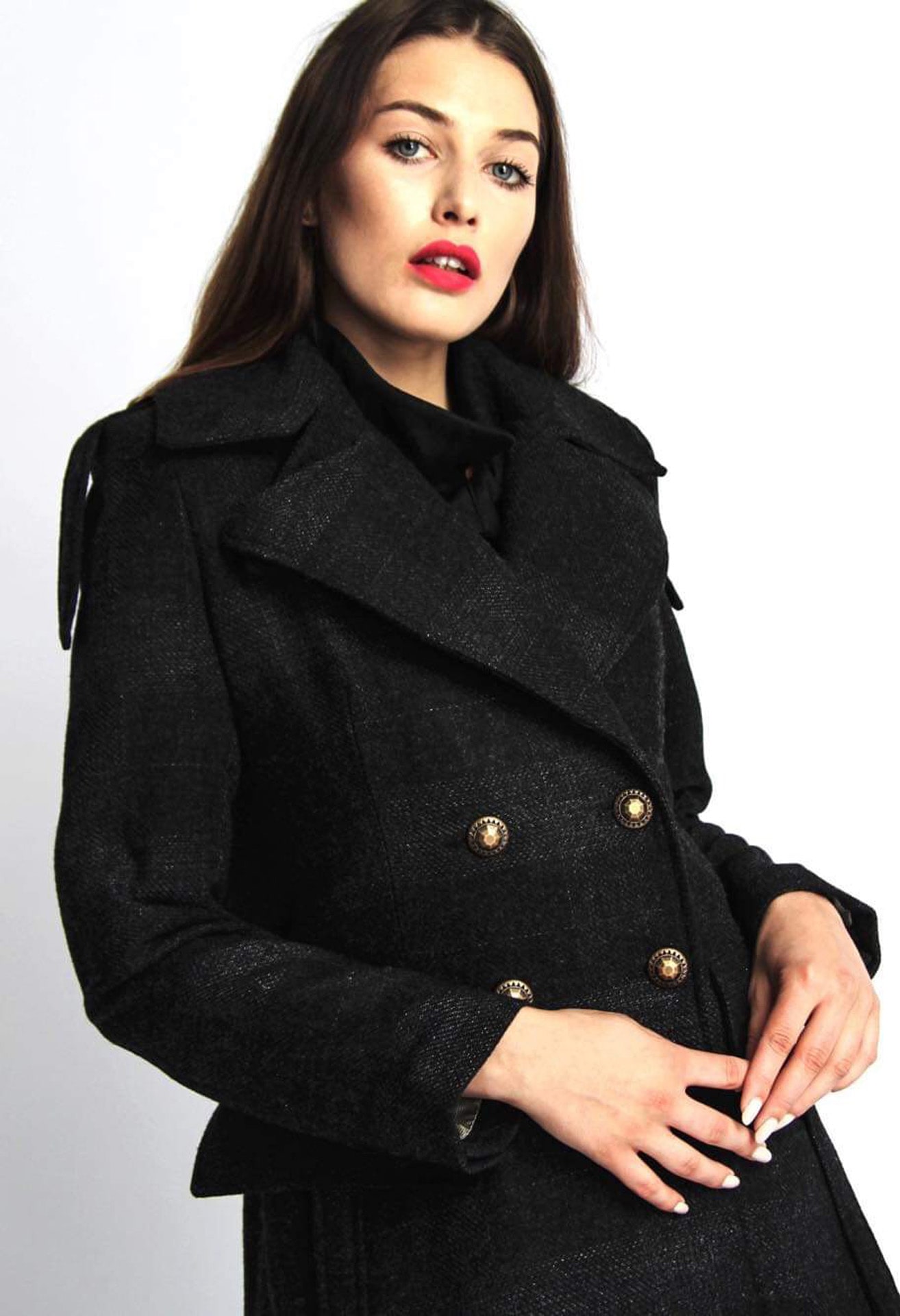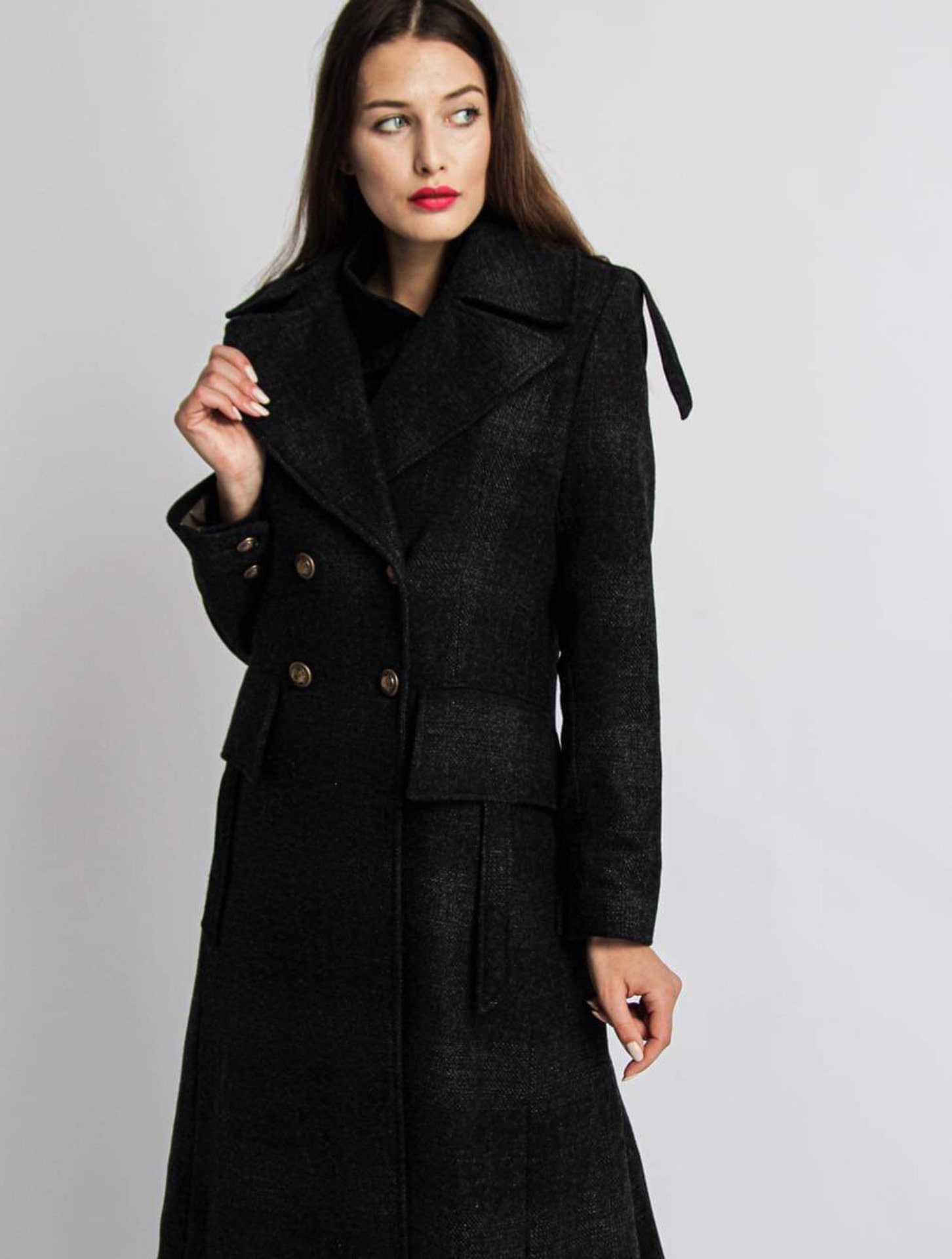 Mantel in Midi-Länge, zweireihiger Verschluss, großer Kragen, zwei Rückenschlitze, gefüttert.